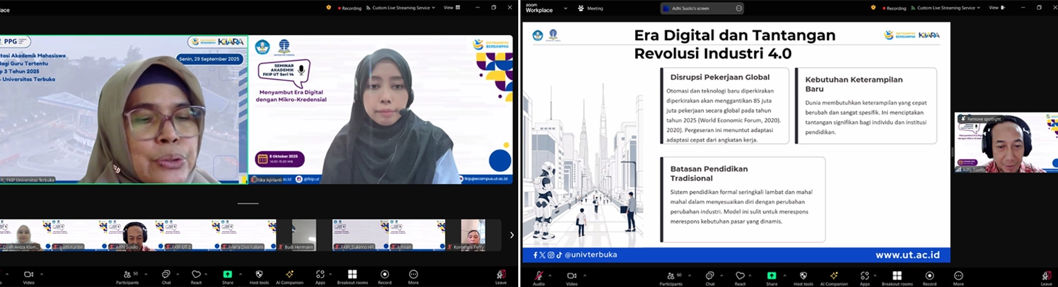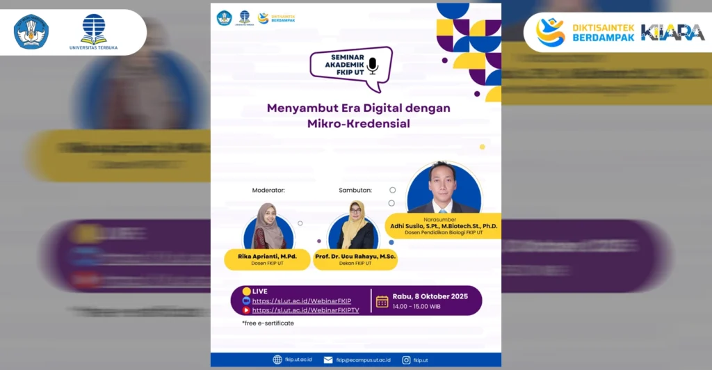 Tangerang Selatan, 8 Oktober 2025 Di tengah percepatan era digital, Fakultas Keguruan dan Ilmu Pendidikan Universitas Terbuka (FKIP UT) kembali menegaskan posisinya sebagai garda terdepan inovasi pendidikan melalui Seminar Akademik Seri ke-14 yang mengangkat tema “Menyambut Era Digital dengan Mikrokredensial.”