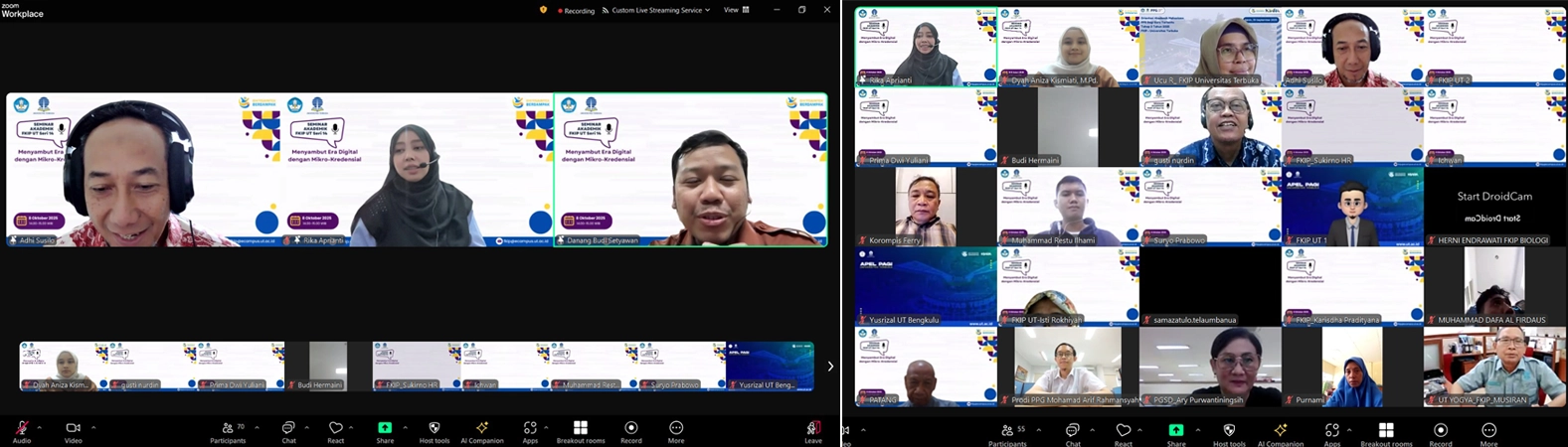 Diselenggarakan secara daring melalui Zoom Meeting dan kanal YouTube resmi FKIP UT, kegiatan ini berhasil menghimpun antusiasme 113 peserta dari seluruh penjuru Indonesia, sebuah bukti nyata akan tingginya kesadaran dan minat sivitas akademika terhadap penguatan kompetensi digital dan sistem pembelajaran masa depan.